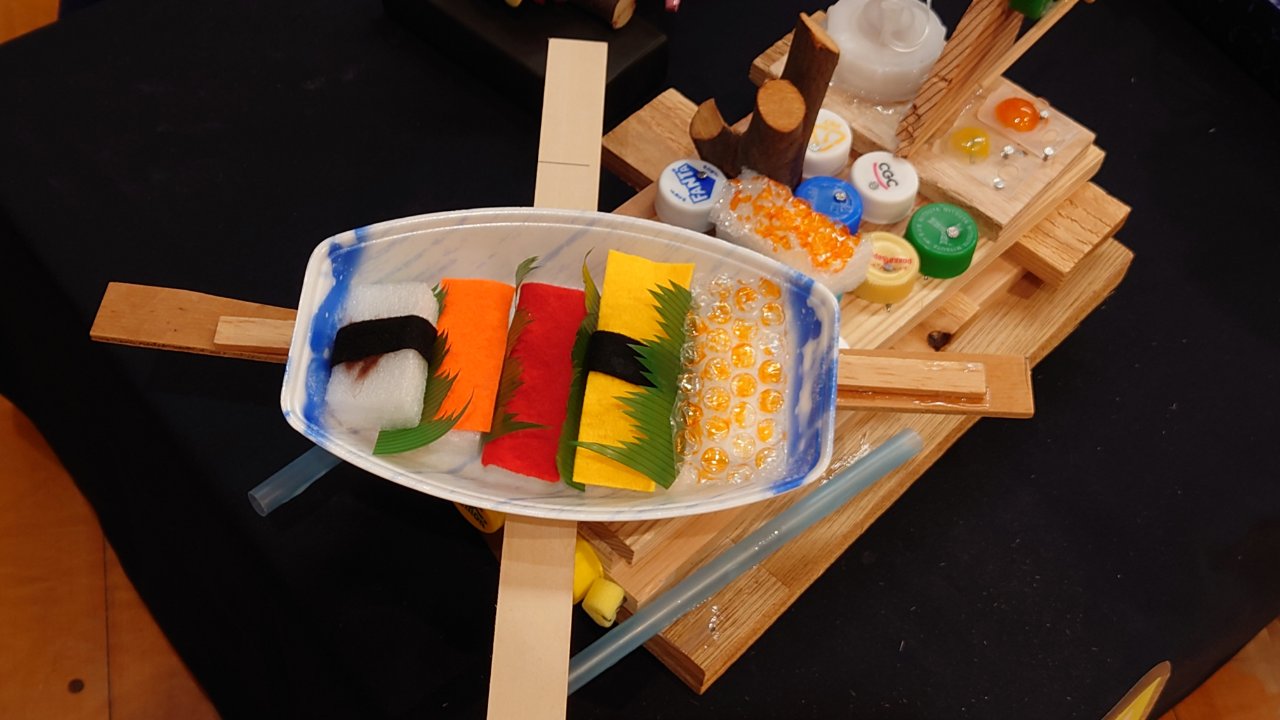 幼稚園なので、3歳児から5歳児までの平面作品や立体作品がずらり。どれも子どもたちが日々楽しみながら描いたり作ったりしてきた力作ばかりで、見ているだけで心が温かくなります。園児の発想力には本当に驚かされます。私たち大人が思いつかない世界が、そこには広がっていました。 さらに感心したのは、5歳児さんたちが協力者メンバーを招き、作品の紹介や遊び方まで丁寧にレクチャーしてくれたことです。その積極性とプレゼン能力には驚きました。自分の思いをしっかり言葉にして伝える姿は、まさに幼稚園教育のたまものだと感じました。中でも、私が思わず「やられた!」と思った作品があります。それは 「おすしのヘリコプター」。 イカ、サーモン、マグロ、玉子…それぞれ本物そっくりの色で再現されているのですが、特に驚いたのはイクラ。なんと、緩衝材のプチプチを使ってイクラの粒感と透明感を表現しているのです!そのアイディアに脱帽しました。しかも、それをヘリコプターに仕上げるとは…。想像の斜め上を行くとはこのことだと、心から感心しました。