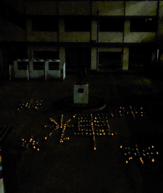 今、中庭には夢プロジェクトで制作した竹灯籠が「輝」の字を形づくり、柔らかな光を放っています。