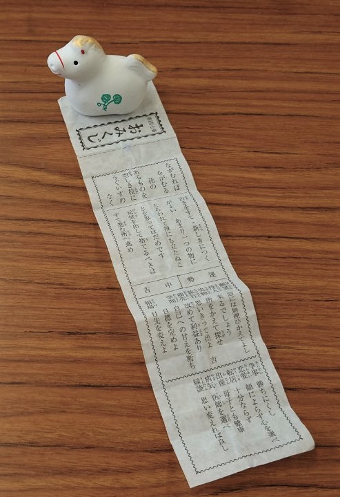 元旦は、嫁さんの実家近くにある久我神社(賀茂別雷神社の境外末社)へ初詣に行きました。近年はここばかりですが、以前はよく上賀茂神社にお参りしていました。久我神社は、上賀茂神社の“親戚”のような存在、あるいはチェーン店のような関係なので、まあ良しとしています。 例年通りおみくじを引きました。いつもは「八咫烏(やたがらす)」のおみくじですが、今年は午年なので、馬の形をしたおみくじを選びました。中には、ぺきぺきに折られた紙のおみくじが入っています。今年の結果は「中吉」。一般的なおみくじのランクは「大吉」「中吉」「小吉」「吉」「半吉」「末吉」「凶」「小凶」「半凶」「末凶」「大凶」の12段階だそうで、「中吉」は上から2番目とのこと。 おみくじには次の歌がありました。
