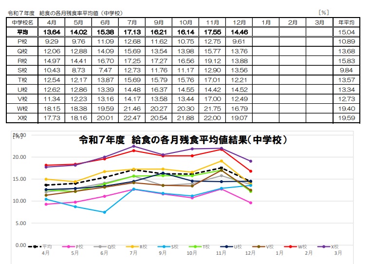 本校はワースト1ではありませんが、給食の残食率は高めです。食材別やメニューで見ると、特に小松菜やキャベツ・ブロッコリーを使ったメニュー、煮物系、ワカサギのフライで残食が目立ちます。 そこで、瀬田中学校では、給食時に食缶をきれいにすべて配膳する力を競う「配膳王グランプリ」を2回実施したところ、残食率は改善されてきました。これからも、食べ物を大切にする心を育てながら、みんなで残食ゼロを目指していきたいと思います。