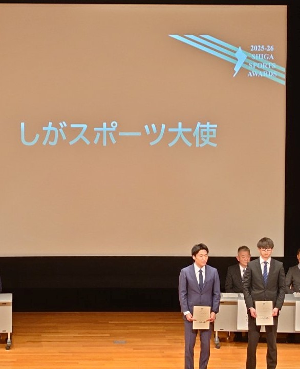 今日、滋賀県民スポーツ大賞の表彰式が行われ、瀬田中学校ボート部が2年連続で「若鮎賞」を受賞しました。多くの高校生が並ぶ中、団体で中学生が選ばれたのは瀬田中だけで、本当に誇らしく、思わず鼻高々でした。 表彰式には、世界陸上・走高跳で活躍する“めがねジャンパー”瀬古優斗選手が滋賀スポーツ大使として参加されており、背も高く、とてもかっこいい方でした。式後、本校の4名の生徒が瀬古選手のもとへ駆け寄り、サインをいただきながら「がんばってください!」と声をかけている姿がとても微笑ましく、きっと生徒たちにとって忘れられない思い出になったことでしょう。
