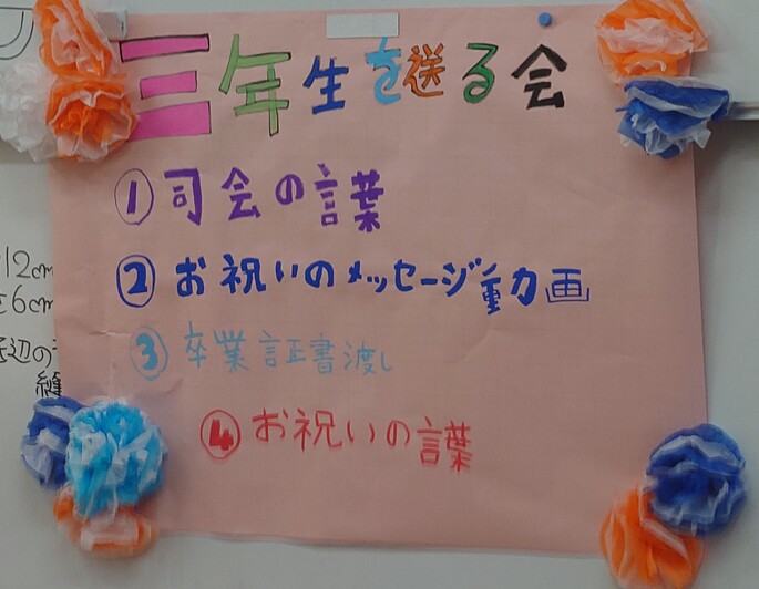 今日の3時間目、11組・12組・13組の全メンバーが被服室に集まり、今年度卒業する3年生5名のために「3年生を送る会」を開きました。 生徒たちが心を込めて準備した お祝いのメッセージ動画 や 手作りの卒業証書 の贈呈など、温かい企画が次々と行われ、卒業を迎える5名の表情は笑顔あり、涙あり。本当に胸の熱くなる時間となりました。 中には、色紙に書かれた仲間からのメッセージを読みながら、思わず涙を流す生徒の姿もあり、周りの仲間も優しく寄り添っていました。 私にも声をかけていただき、ひと言お祝いの言葉を述べさせてもらいました。 改めて、生徒たちがお互いを思いやり、相手を喜ばせたいという気持ちで動く姿に、大きな成長を感じました。 会の最後には、みんなで記念撮影。 それぞれが本当にいい表情をしていて、このクラスの温かさがそのまま写真に写り込んでいました。