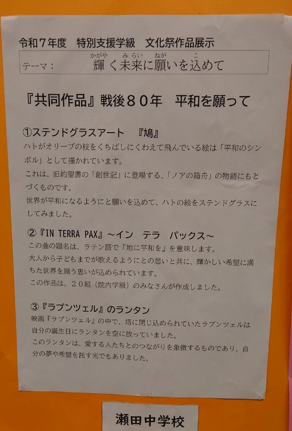 1月30日(金)から本日2月3日(火)までの期間、大津市歴史博物館において「大津の子ども総合美術展」が開催されました。本展では、大津市内の小・中学校の代表作品が展示され、瀬田中学校からも多くの生徒の作品が出展されました。いずれの作品も、児童・生徒一人ひとりの創造力や個性がよく表れており、大変すばらしい内容でした。今後も生徒たちの芸術活動への意欲がさらに高まることを期待しています。