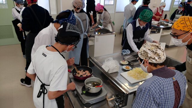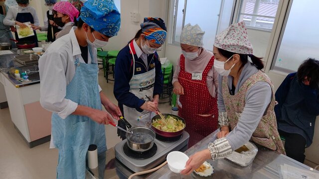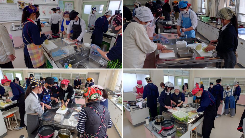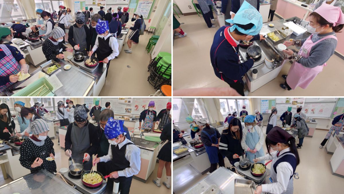 今年度も、昨年度に引き続き、地域の方々と保護者の皆さまにボランティアとして参加していただき、温かなご協力のもと実習を進めています。生徒たちは地域の方と会話を楽しみながら調理をするなど、普段の授業では得られない交流の機会にもなっています。地域の方からも「楽しい時間です」との声をいただいており、生徒・地域双方にとって貴重な学びの場になっています。