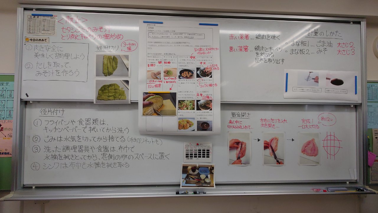 家庭科の調理実習3日目。今日は2年3組。地域の調理実習ボランティアの皆さま9名にご協力いただきながら、「セタシジミのみそ汁」「とり肉とキャベツの塩炒め」 に取り組みました。実習中には、日頃から家庭で料理をしているのだろうと感じさせる生徒の姿が多く見られました。キャベツの芯の取り方、鶏肉を観音開きにする際の包丁の角度、あく取りの手際など、細かな動作から丁寧さや経験が感じられました。中には、炒め物の最中にフライパンを上手にあおる生徒もおり、「おぬし、できるな」というまなざしが向けられる生徒もおりました。