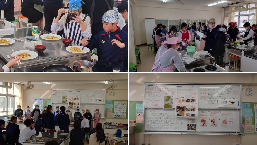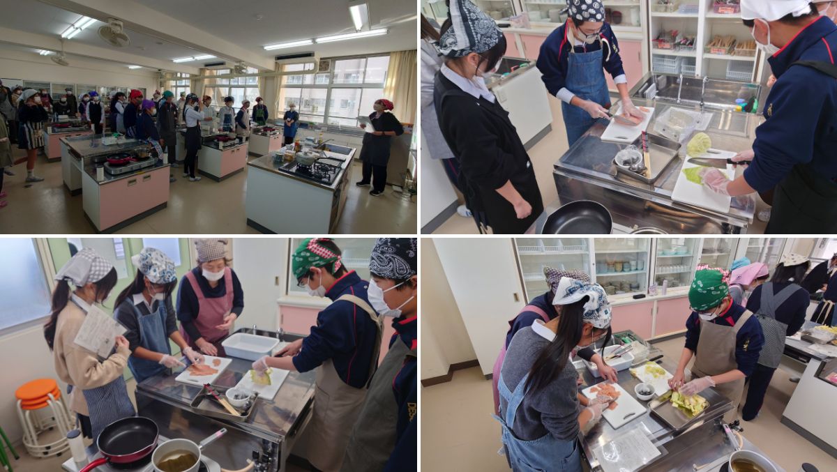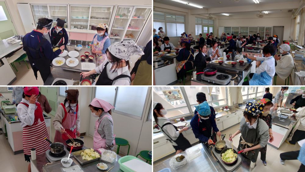 実習では瀬田シジミの味噌汁や鶏肉とキャベツの塩炒めを作り、どの班もおいしく仕上げることができました。食べるときには笑顔があふれ、生徒たちにとって貴重な経験となりました。調理技術だけでなく、調理実習ボランティアの皆さまとのあたたかい交流も、大きな学びとなりました。