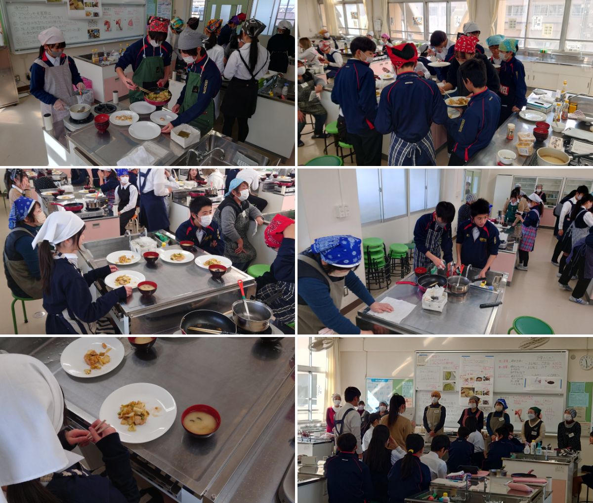 1月28日から2月6日にかけて行ってきました2年生8クラスの家庭科の調理実習が、本日無事に最終日を迎えました。この8日間、地域の皆さま、保護者の方々、学習支援員の皆さまなど、延べ100名近くの方々にお力添えをいただきました。心より感謝申し上げます。コロナ禍で十分な調理体験ができなかった生徒たちにとって、皆さまの存在は本当に心強く、三角巾やエプロンの付け方にはじまり、包丁やまな板の使い方、あくの取り方まで、基本から丁寧に教えていただきました。そのおかげで、生徒たちは班の仲間と協力しながら、意欲的に取り組むことができました。