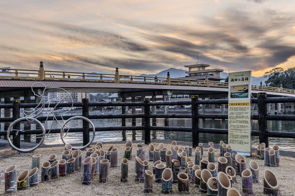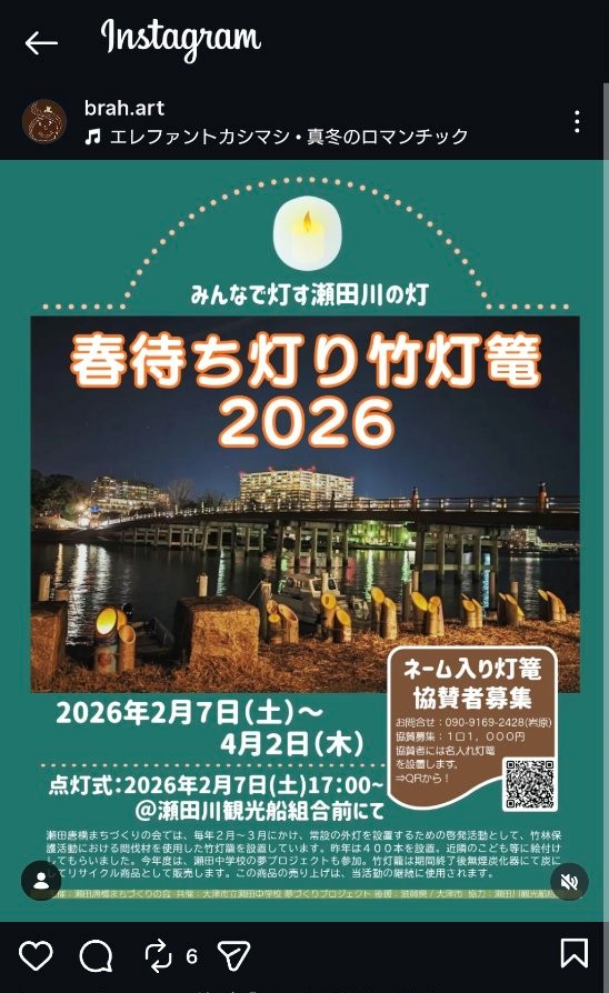 「春待ち灯り竹灯籠」は、瀬田唐橋まちづくりの会が主催する、大津市・瀬田唐橋周辺の瀬田川沿いを明るく照らす地域参加型のライトアップイベントです。放置竹林の間伐材を利用して作られた竹灯籠に、子どもや地域の方々が絵や文字を描き、太陽光LEDの柔らかな光が夜道を温かく彩ります。今年は 2月7日(土)から4月2日まで 点灯が行われ、瀬田中学校も“夢プロジェクト”の一環として参加しています。本校の中庭に展示していた竹灯籠を運び出し、生徒会のメンバーがデザインした「輝」の文字を形作るように並べています。