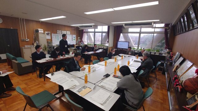 協議に先立ち、委員の皆さまには1・2年生の授業を参観していただきました。生徒が落ち着いて学習に取り組んでいる様子や、居眠りしている生徒に周囲が自然に声を掛ける姿などについて感想をいただきました。また、学び方やタブレット端末の活用など、以前との大きな変化にも驚かれていました。協議では、生徒指導主事の芦田先生から最近の学校の様子について、教務の木村先生からは学校経営評価の説明と報告がありました。評価項目のポイントの変動について、要因や背景をめぐって委員の皆さまから質問や意見が出され、理解が深まりました。
