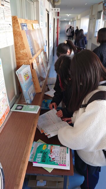 2年生は、3年生になって受験勉強で活用する「新研究」の見本が職員室前に並び、内容を真剣に確認する姿が多く見られます。1・2年生とも今日からテスト前期間に入り、部活動はなく、放課後にはSETA塾で学習に取り組む生徒もいます。4月に向けた準備がそれぞれのペースで進んでいます。