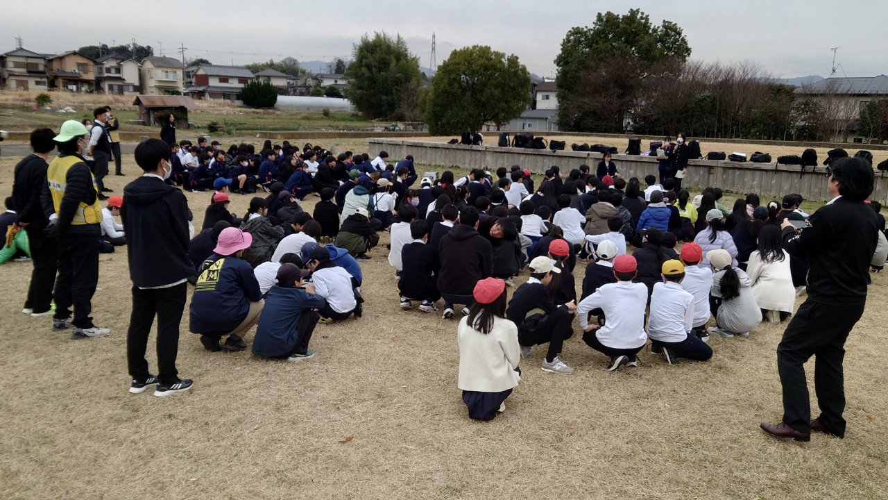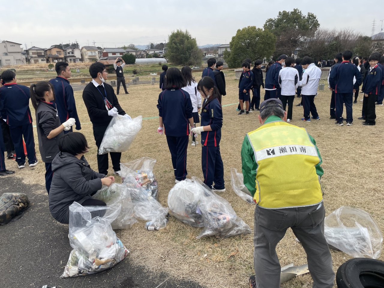 瀬田中学校生徒会は「瀬田のまちをきれいにする」を目標に、年に1回、瀬田南幼稚園・瀬田南小学校と協力して国庁跡周辺の清掃活動に取り組んでいます。今年度は瀬田南小学校6年生とともに清掃と地域理解のレクリエーションを実施し、地域の皆さまにもご参加いただくことで、世代を超えた交流の場となりました。広い国庁跡では、瀬田南小学校6年生の4クラスがエリアを分担してゴミ拾いを行いました。瀬田中学校の生徒は瀬田中の中庭から国庁跡に向かって二手に分かれて出発し、道ばたのゴミを丁寧に回収しながら向かいました。その結果、歴史ある国庁跡と通学路の一部をいっそうきれいな環境に整えることができました。