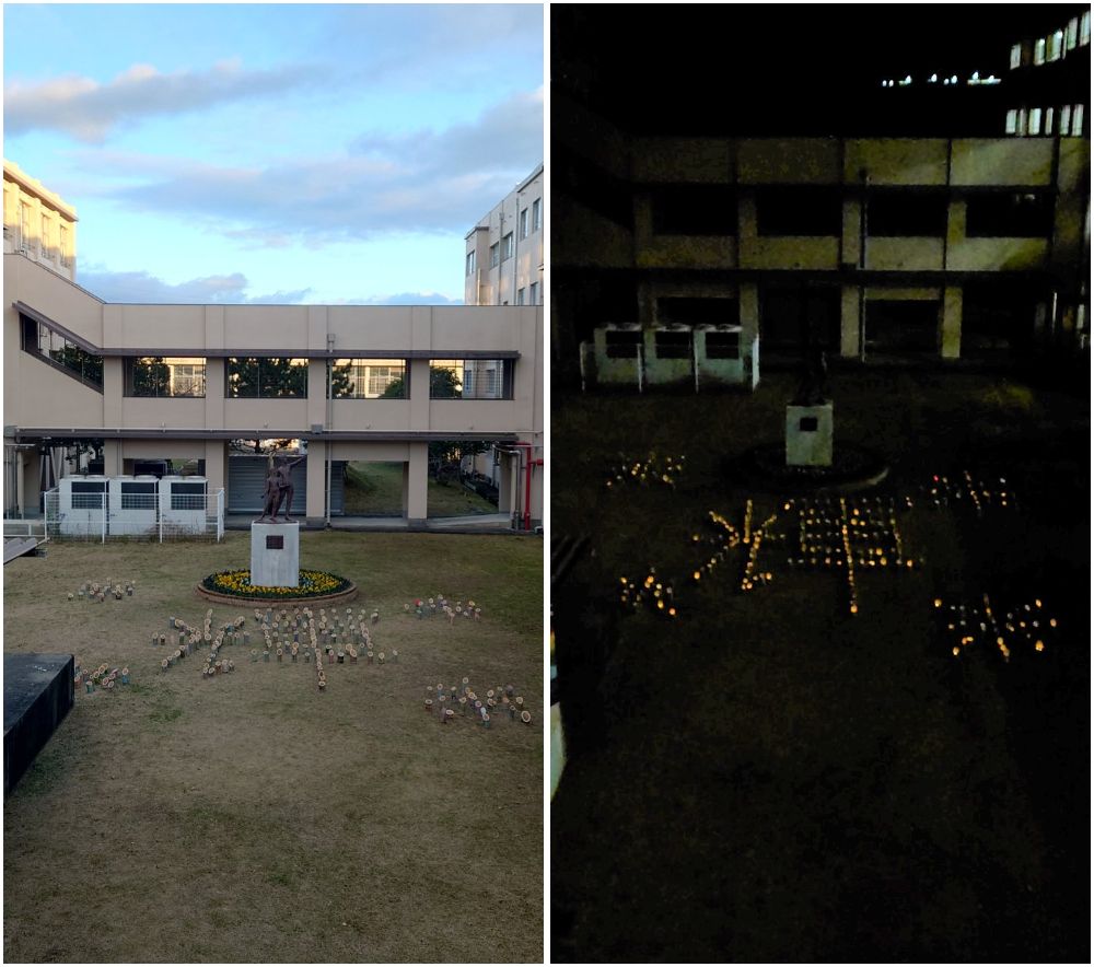 その竹灯籠は、昨日から生徒会執行部のメンバーによって中庭の「はばたきの像」の前に並べられ、プロジェクトはいよいよクライマックスへ!全校生徒の竹灯籠で「輝」という一文字を形づくりました。昨日は設置のみでしたが、今日はペグで固定し、竹灯籠の中にLEDライトを設置。暗くなると灯籠が光り、「輝」の文字が夜の中庭に幻想的に浮かび上がります。