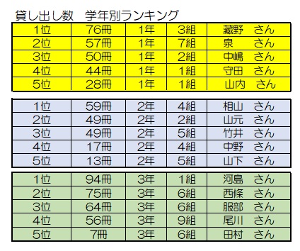 2学期もたくさんの本を借りていただき、ありがとうございました。貸出冊数は合計で987冊となり、昨年の2学期705冊を大きく上回りました。ちなみに、昨年は1学期438冊、2学期705冊、今年は1学期687冊、そして今回の2学期987冊と、着実に増えています。みんなの読書への関心が広がっていることがとても嬉しいです。今回、学年別に本を借りた生徒のベスト5と総合ランキング、さらにクラス別総合ランキングを発表します。貸出がゼロのクラスもありましたが、図書室には漫画や小説版漫画なども、楽しい本もたくさんありますので、ぜひ気軽に立ち寄ってください。