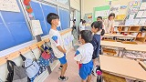 1年生はスピーカーに体を向けて、耳を傾け、このセレモニーに参加します。