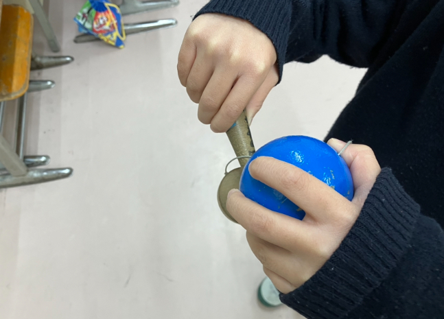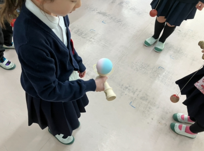 生かつかのじかんに、いろいろなむかしあそびにちょうせんしている一年生。けん玉、こままわし、あやとりなど じゅぎょうのじかんだけでなく、