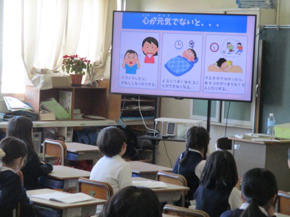 今日のテーマは「心の健康を大切にしよう」です。心がしんどくなると、身体の不調につながります。よく寝て、好きなことを楽しみ、いやなことがあったら誰かに伝え、心をリフレッシュしましょう。しかし、いつもリフレッシュがうまくいくとは限りません。そうするとストレスがたまっていきますね。そんなときは、深呼吸をしたり、身体を動かしたり、自分を褒めるなど解消に努めてください。それでも、解消されなかったり、大きなストレスを抱えきれなくなったら、様々な相談機関があります。一人で抱え込まないで、誰かと悩みを共有しましょう。
