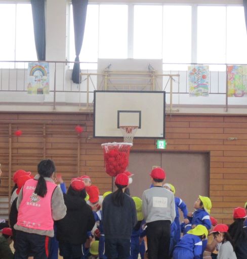 5年生と保育園との「55交流」が体育館で行われ、仲良く玉入れをしている姿が見られました。保育園児の笑顔はもちろんかわいくて癒やされるのですが、5年生が保育園児と関わっているときの優しい表情がとってもすてきでした。
