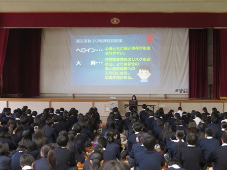 今日は3時間目に2年生で薬物乱用防止教室が行われました。今回は東学区の学区民会議の主催でもあり、地域の方もたくさん来ていただいていました。大津署の生活安全課の方に講師をお願いして、違法薬物の紹介や症状、怖さ、どのようなきっかけで始めるか、また断り方などスライドを使ってわかりやすく説明いただきました。手を出すきっかけは好奇心が最多で、一度摂取すると依存性があり、やめられなくなること、そしてそれが体にとってどんな影響があるかをわかりやすく説明していただきました。薬物やアルコール、たばこ、医薬品の使い方など保健の授業でも行いますが、外部の方から聞くと説得力があり、再認識できたと思います。