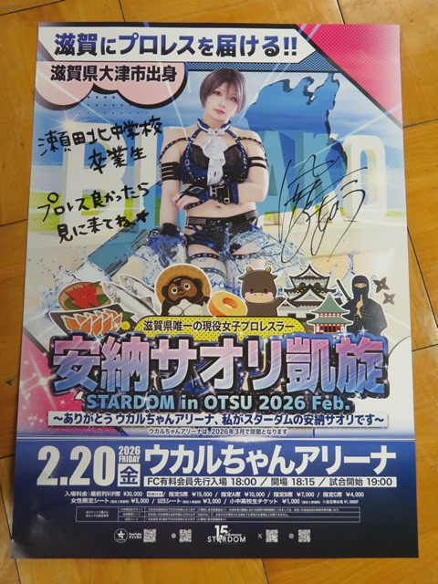 2006年度の本校の卒業生で現在、滋賀県唯一の現役女子プロレスラーとして活躍している安納サオリさんが試合の宣伝のため来校されました。今回、滋賀にプロレスを届けるために凱旋。2月20日(金)19:00からの試合に瀬田北中学校の生徒、教職員の皆さんを無料招待してくれるそうです。詳細は後日お知らせしますが、可能ならなるべく多くの人たちが応援に行ってあげてほしいですね。