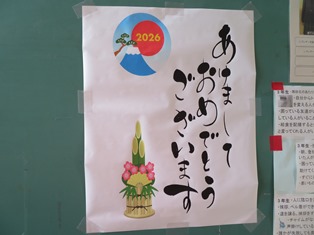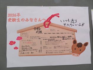 校舎のあちこちに新年になったことをお祝いする掲示物等が飾られています。学年フロアーに行くと、年が変わって、やる気がさらに高まるような掲示物も見られます。特に3年生は絵馬に見立てて、かなりこった作品となっています。ただ、小正月と言われる1月15日には、正月気分を一新するという風習があります。少し名残惜しさはありますが、気分を一新して前に進んでいきたいものです。