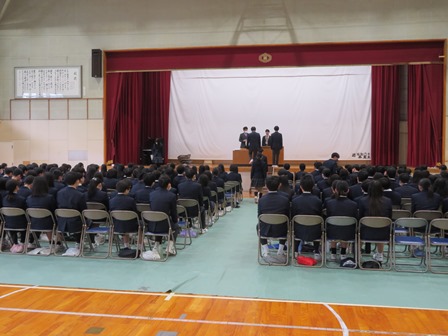 3年生は公立一般選抜・独自型選抜入試を終え、昨日から6日の卒業式に向けて、急ピッチで練習に入りました。体育館はエアコンが入るので、例年の寒さに耐えながら完璧防寒しなくても良くなりました。式練ではさすが3年生の集中力は素晴らしく、先生の指示に本当に気持ちよく動いていました。卒業証書をもらいに行く動きも一通り確認し、後は自信を持って動けるようにあと二日練習をしてもらいたいと思います。式練では式歌の練習もしています。大変すばらしい歌声を響かせていました。本番が楽しみでなりません。
