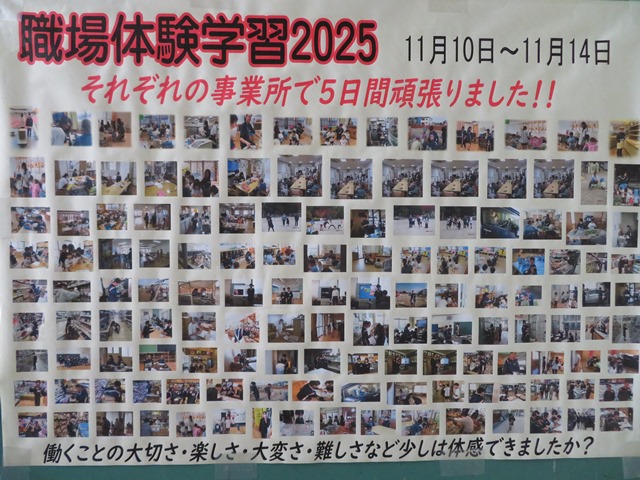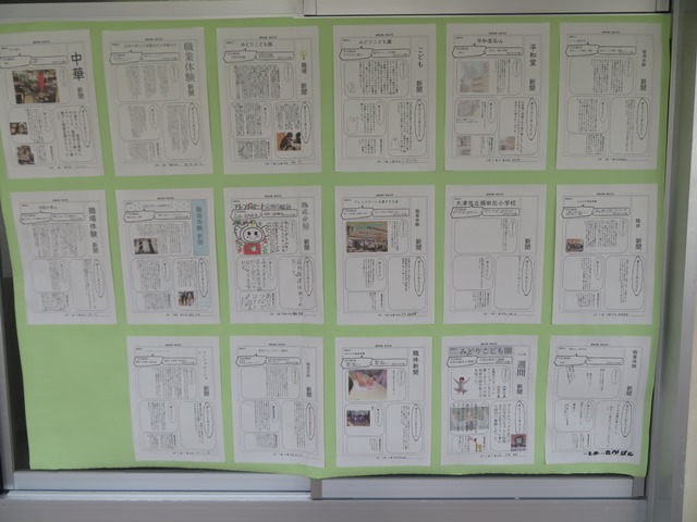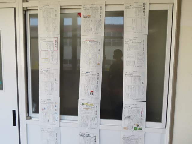 昨日は各学年ともに懇談会に向けての準備をしていました。2年生は先日行った「職場体験」の事後学習で作成した個人新聞を廊下に掲示してあります。タブレットがないときは、手書きで行っていましたが、大半はタブレットを使って作成してくれたもので、色彩も鮮やかでひきつけられました。内容も読みやすく工夫を凝らしており、完成度の高い新聞と言えます。保護者の皆様は待ち時間に、じっくりお読みいただければと思います。