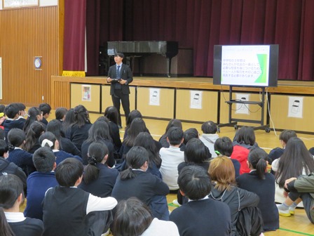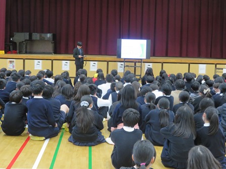 来年度入学する小学校6年生の不安を和らげるために、中学校の教員が小学校に行って授業をさせていただきました。小中連携事業の一環でかなり前から実施しています。私たちは「出前授業」と呼んでいます。本年度は、11月に瀬田北小学校に、昨日9日に瀬田東小学校に教務主任と生徒指導主事が出かけて、150人ほどの児童に出前授業を行いました。大半は中学校というところを少しでも知ってもらう内容ですが、中学校の学習や生活への不安が少しでもなくなればよいなあと思います。