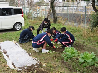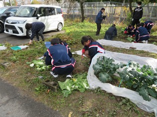 今日は寒い中、12・13組の生徒が瀬田北菜園の収穫をしてくれていました。一生懸命育ててくれた野菜は白菜と枝豆です。あとブロッコリーもありますが、まだ少し小さいです。無農薬なので虫が食べているところもありますが、見事に育って美味しそうです。自分たちで作った野菜って良いですね。私も過去違う学校ですが、学校菜園で一緒に野菜を育てていた経験があります。耕運機で土をならしたり、水をあげたり、石拾いをして、とうもろこしとサツマイモと青ネギをつくりました。できたとうもろこしを焼いて砂糖醤油をつけて食べたときは格別だったのを覚えています。一度自分で作ったニラでニラ玉を作るのが夢です。