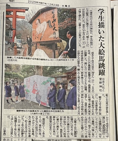 美術部が制作した大絵馬を萱野神社に奉納した様子が京都新聞に掲載されました。