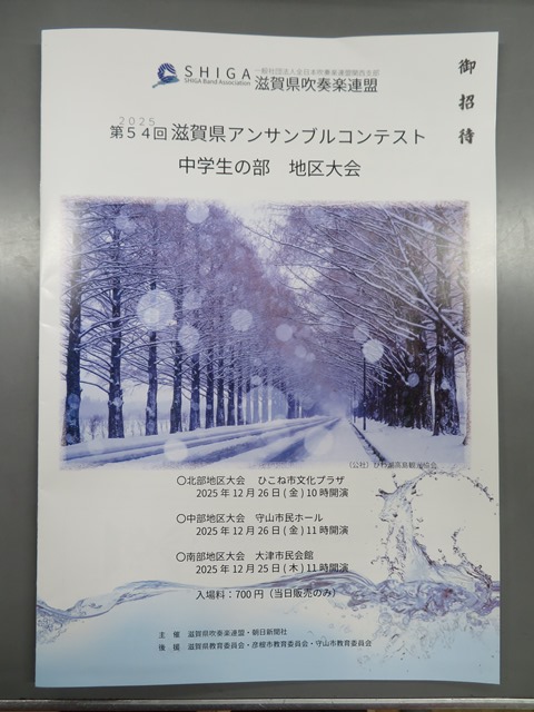 今日は吹奏楽連盟主催のアンサンブルコンテスト南部地区大会が行われました。校長先生が大津市民会館に鑑賞に行っていただきました。本校の出演者は多くの部員から選出された金管8重奏を披露してくれました。金管楽器は迫力があるが、大変演奏が難しいと言われています。迫力満点で、とても好印象の演奏だったと聞いています。館内は写真撮影が禁止だったので、演奏中の写真はとれなかったそうです。パンフレットのみ掲載しておきます。