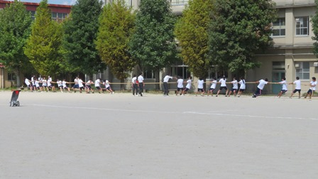 体育の授業では体育祭の練習も進んでいます。グランドでは3年生が大縄と綱引きの練習をしていました。これから代表リレーや全員リレーの練習も入ってくるのですね。まだまだ暑い日が続きますので熱中症には気をつけていきましょう。