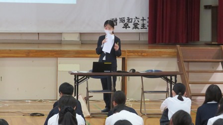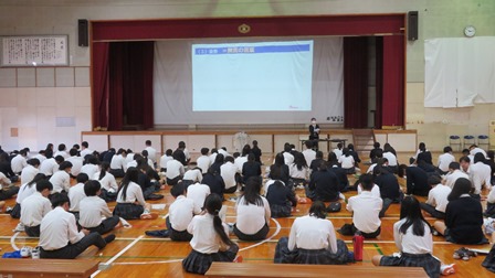 今日の3,4校時に2年生はしがぎん経済文化センターのインストラクターをお招きし、マナー講座を実施いたしました。体育館に集まり、5クラスずつが受講しました。内容は、ビジネスマナーの一番は、あいさつだという話を聞きました。あいさつとともに、お辞儀の仕方を学びました。「アイキャッチ→言葉→お辞儀→アイキャッチ」の流れを教えていただき、敬礼について実演を交えて、伝授いただきました。(お辞儀は3種類あり、会釈(15度)、敬礼(30度)、最敬礼(45度)です)練習を重ねると、大変気持ちのよい挨拶とお辞儀できるようになりました。社会人になるまでに必ずマスターしておきたいものですね。そのためにも、授業の始まりと終わりに訓練をするのもいいかもしれません。今日教わったことはこれから必ず直面する面接を受けるに際して直結することだと感じました。面接直前になって、あれこれ悩むより、日ごろから努力することを忘れず、自分の頑張ったことを記録しておくことが大切さですし、面接前にその記録を見直して、自分の頑張りを整理して話せばいいと感じました。本当によい機会に、ためになる話が聞けたと思います。