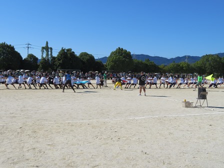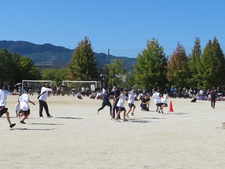 雲一つないまさに秋晴れの天気の下、1年生にとっては中学校に入学して初めての体育祭が行われました。種目は2年生と同じように大縄跳び、玉入れ、二人三脚、綱引き、全員リレーと、まさしくクラスの団結で勝ち上がる種目ばかりでした。保護者も約230名の方が応援に来られて盛り上がった体育祭でした。どのクラスも各種目が始まる前にはクラス全員で円陣を組み、団結を深めていた姿がとても印象的でした。来年、再来年が期待できる体育祭だったと思います。