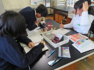 本日は校舎内を巡回しながら、久々にいくつかの授業を少しですが見学させてもらいました。まず2年生の理科の授業では、電気の回路で直列回路・並列回路の各区間に加わる電圧の大きさはどうなっているか、またそれぞれどのような関係になっているかの実験を見せていただきました。私には難しいと思われる回路が組まれていて、電流と電圧の関係を学習していました。