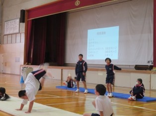 次に体育館では1年生の体育の授業を参観しました。マット運動ですがマットに慣れるためにアザラシやウサギ、クマなど動物の動きを真似た運動を順番にしていました。スクリーンにやる内容が投影されていて非常にわかりやすく、怪我のないようにマット運動に取り組んでいました。