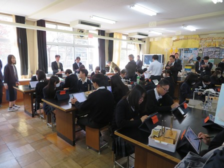 今日は本校を会場に滋賀県の理科の研究発表会がありました。朝から県下各地から40名を越える理科の先生が一同に介し、1年二クラスの授業を参観しました。その後研究協議会や記念講演が行われました。