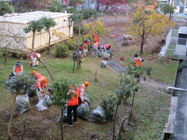昨日になりますが、レイカディア大学の同窓生で作るボランティアの方々が中庭や校内の植栽の剪定に来ていただきました。本来は小学校を中心に年に2回剪定のボランティアをされているのですが、今回伝手を頼って夢プロの相談をさせてもらったところ、快く引き受けて下さって、当日は16名もの方が剪定に来ていただきました。お陰で中庭や金工室前、テニスコート横の植栽がきれいに剪定されました。来年度もこの時期に来ていただけると言うことで環境整備という点で強い味方が出来たと思います。