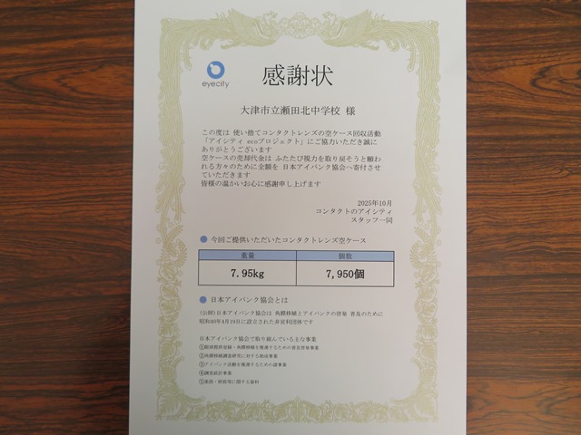 うれしいご報告です。この学校日記の7月14日に使い捨てコンタクトレンズ空ケース回収のご紹介とご協力をお願いしました。その後たくさんの方が協力していただいたお陰で公益財団法人日本アイバンク協会から感謝状をいただきました。ご報告と今後ともご協力よろしくお願いします。