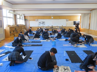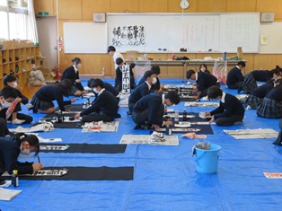 3年生は書写の授業が始まっています。4多目でブルーシートを広げて全員が賢明に筆を走らせています。筆心のない私にとってみんな上手に書いている作品に感心しました。