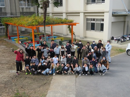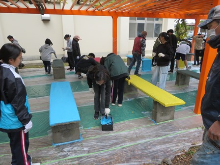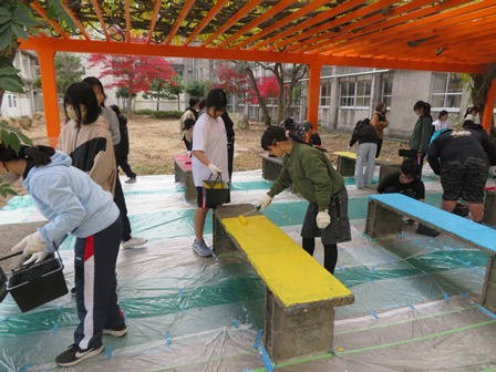 学校夢づくりプロジェクトも佳境に入りました。本日は藤棚の下のベンチのペンキ塗りを夢プロメンバーの他、Rengerや小学校からも参加者を募り、50名近い人数で行いました。業者の方にアドバイスをしていただき、まずは下地塗りから行いました。それが乾くまで少し時間があったのでその間グラウンド周辺の落ち葉拾いをみんながしてくれました。そのあと全員で色とりどりのペンキを使い3度の塗り重ねを得て、ようやく終了しました。藤棚がオレンジのように輝き、その下のベンチが色とりどりで輝きました。4月当初ジャングルのようだった中庭もたくさんの方のお陰で本当に再生されました。これからここが生徒の憩いの場になることに期待が膨らみました。参加していただいたみなさんお疲れさまでした。