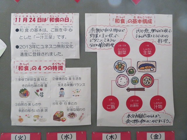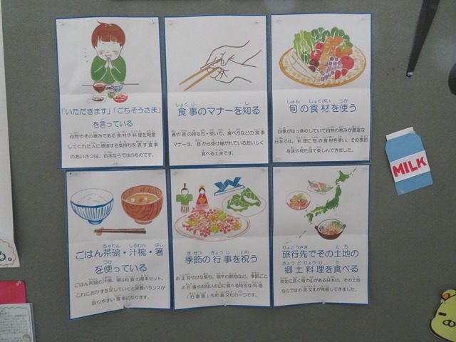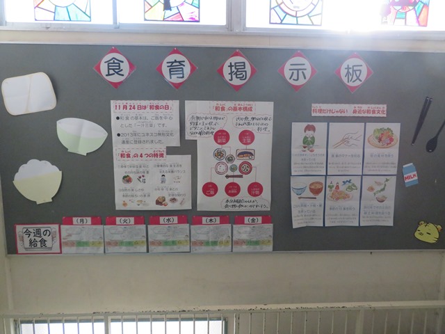 南校舎B階段の1階から2階の踊り場に毎日の給食の献立やカロリーなどを大変わかりやすく掲示しています。提供された給食を食べるだけでなく、その食材の栄養やカロリーを考えながら食べることにより好き嫌いや残食も減ることにつながります。食は単に栄養を摂るだけでなく、心身の健康を育み、豊かな人間性を形成する上で不可欠な要素です。食育を通じて、健康的な食習慣や食文化への理解を深めることが重要です。毎日確認しましょう。