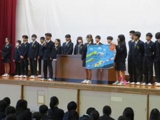 「この2学期も、皆さんは落ち着いて学習活動に取り組くんできましたね。朝、すべての教室をまわると、静かな雰囲気のもと、朝読書や朝学習に取り組んでいる姿を見ていつも感心しています。先週は3年生の学校長推薦を希望する人の面接をしていたのですが、面接を受けに来た人からは、受験に臨む覚悟がひしひしと伝わってきて頼もしく感じました。「瀬田北中学校のよいところは?」という質問を皆さんにしたのですが、一番多かった答えは、「多くの人がいて、色んな意見が聞けて視野が広がった。」、「多くの人に助けてもらった。」、「たくさんの友達ができた。」というのが多かったです。生徒数が多いことを強みとして捉えており、素晴らしいことだと感じました。