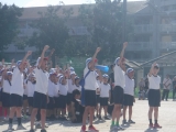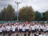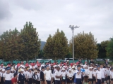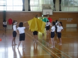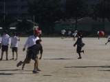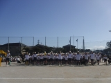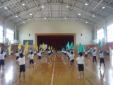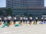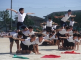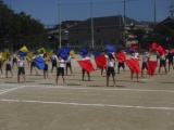 屋外での旗体操・組体操練習が始まりました。体育館とは違って、砂や日光が子どもたちの体力や集中力を奪っていきますが、本番に向けて一生懸命練習に取り組んでいます。