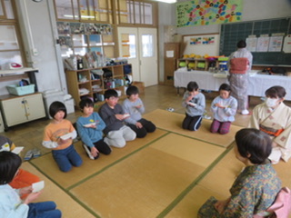 今日は、近江神宮の勧学館で活動されている「あきのた会」の皆さんに来ていただき、「かるた教室」を実施しました。競技かるたは初めての子どももいましたが、どの子も意欲的に楽しく活動することができました。