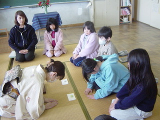3から6年生対象に茶道の先生をお招きして、茶道体験をしました。お作法やこの地域のお茶の歴史を教えてもらいながら、お菓子と抹茶を味わいました。