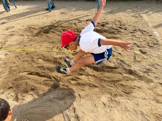 思いきりジャンプ!「もっと遠くに跳びたい!」と、みんなやる気いっぱいです。友だちと記録を比べたり、応援し合ったりしながら、楽しく体を動かしています。