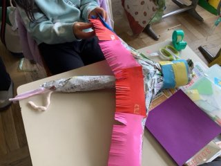 新聞紙やハンガーを使って鳥の体の土台を作り、画用紙や綿などの素材で羽や模様を自由に装飾しています。