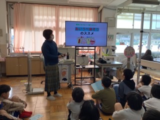 身体測定の前に、保健室の先生から食生活のお話をしてもらいました。早寝、早起き、朝ごはん、好き嫌いをせずバランスよく食べて、健やかに成長していってほしいと思います。