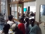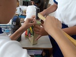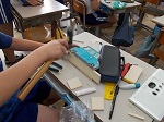 トントンと音がするので教室をのぞきました。6年生がテープカッター台を作っていました。お気に入りのデザインを板に描き、電気のこぎりで形を切りました。直線だけでなくカーブのところも、電気のこぎりでうまく切り取っていました。切り取ったデザインに絵の具で色付けし、金槌を使い、板同士をくぎで打ち込みながら組み立て完成です。くぎを打つときに板が離れてしまうので、友だちに板を支えてもらいながら、互いに協力し合って作っていました。後ろの観察台には、出来上がった自分だけのオリジナルなテープカッター台が並んでいました。