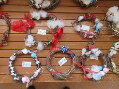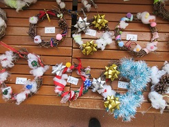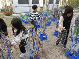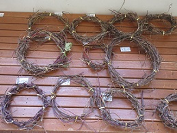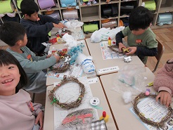 先週、あさがおのつるを使って、リースを作りました。今日は、作ったリースに飾り付けをしました。リボンをつけたり、綿をつけたりして、思い思いに飾りつけたリース。とてもかわいく仕上がりました。 | |||